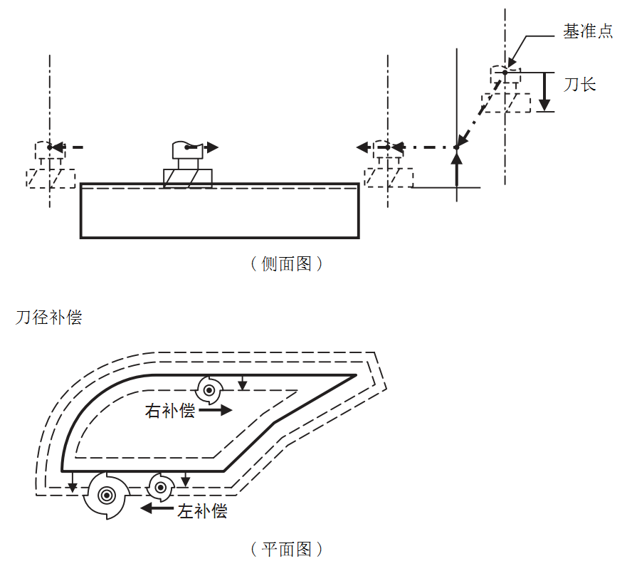 基本刀補(bǔ)功能如下圖所示,分為刀長補(bǔ)償與刀徑補(bǔ)償。通過刀補(bǔ)編號指定各補(bǔ)償量。且通過設(shè)定顯示裝置或程序輸