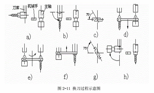 機(jī)械手將刀具從刀庫中取出送至機(jī)床主軸上,然后將用過的舊刀送回刀庫.其動作過程簡述如下(結(jié)合如下?lián)Q刀過程示意圖4 3) :